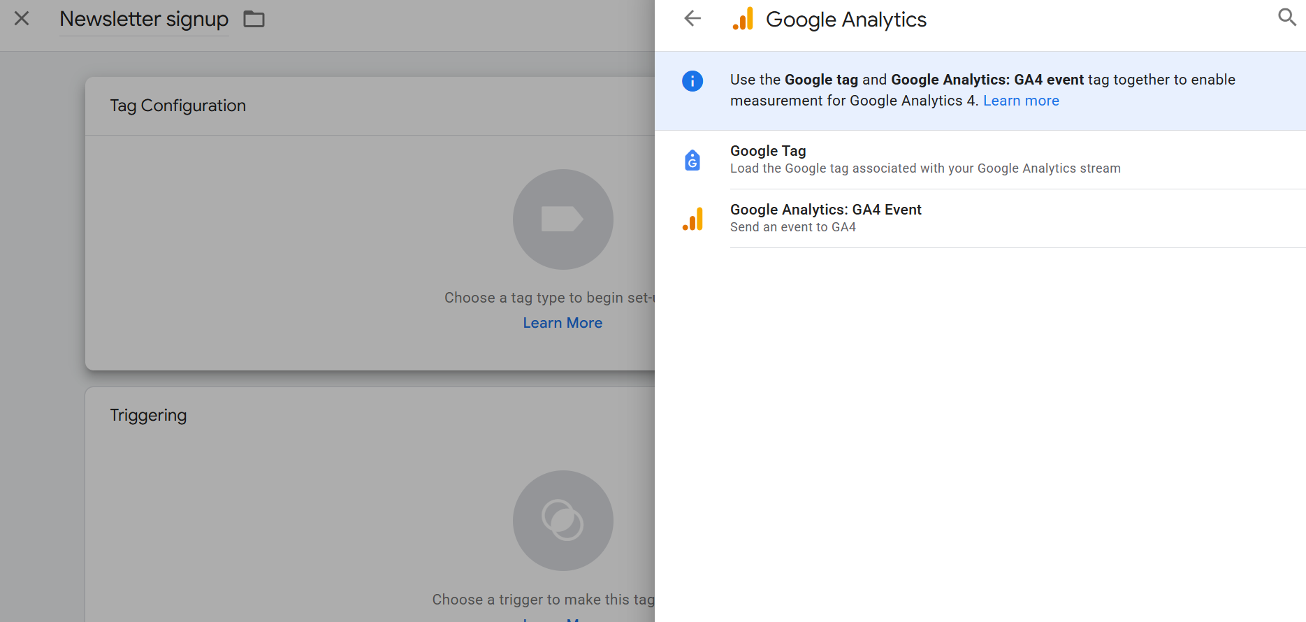 - From the “Choose Tag Type” list, select “Google Analytics: GA4 Event.”